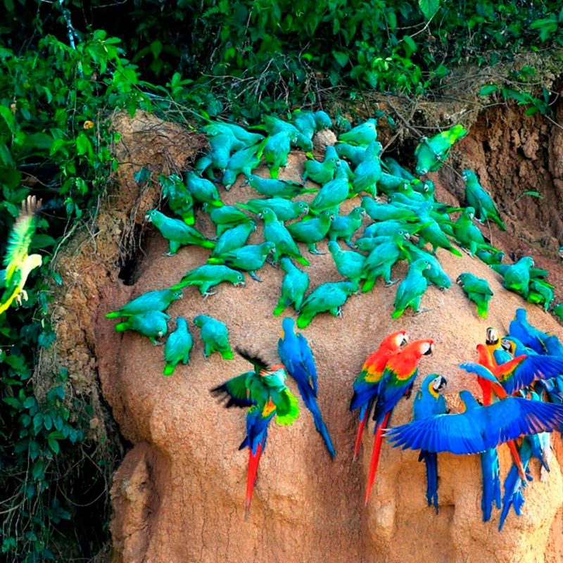 En las mañanas más despejadas del año, docenas de guacamayos grandes y cientos de loros se congregan en esta gran orilla del río en un espectáculo estridente y colorido que inspiró una historia de portada de National Geographic. Discretamente ubicado a cien metros del acantilado, observaremos guacamayos de alas verdes, escarlatas y azules y dorados, y varias especies de loros más pequeños descienden para ingerir arcilla. Las salidas son al amanecer antes que inicien su actividad.